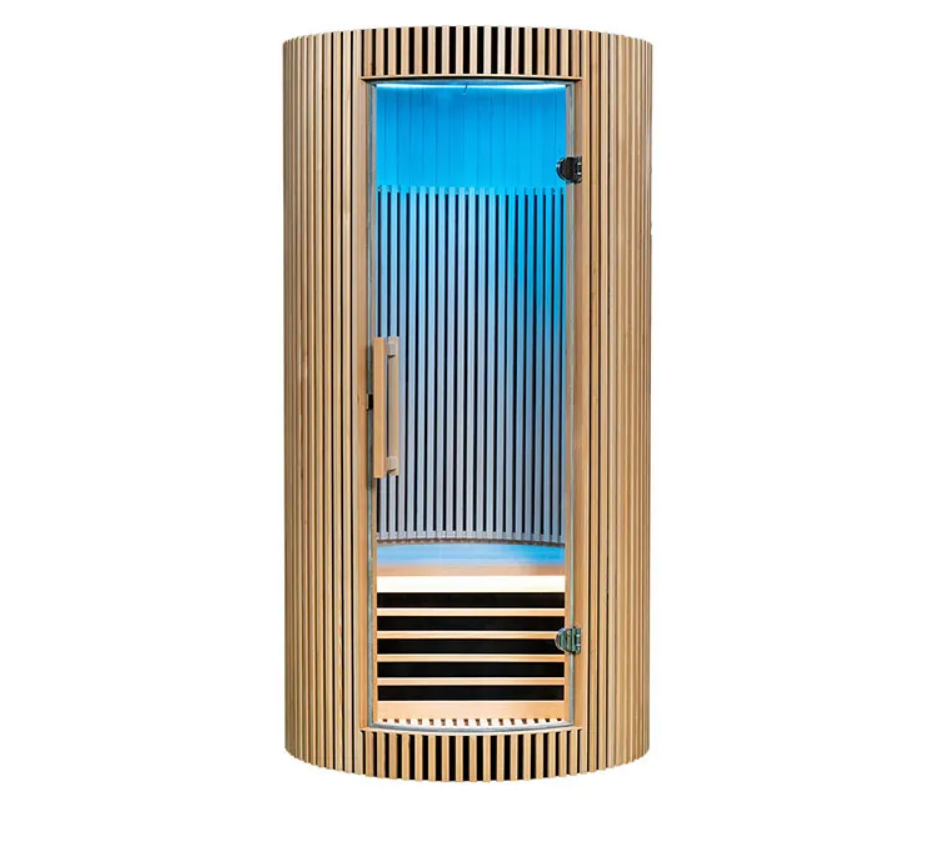 Rompe con las líneas rectas. The Zen Capsule adopta una forma cilíndrica natural que no solo es estéticamente impactante, sino energéticamente eficiente. Su diseño envolvente permite que los emisores de infrarrojos de espectro completo (Full Spectrum) incidan sobre tu cuerpo desde todos los ángulos, garantizando una terapia de calor uniforme sin puntos fríos.